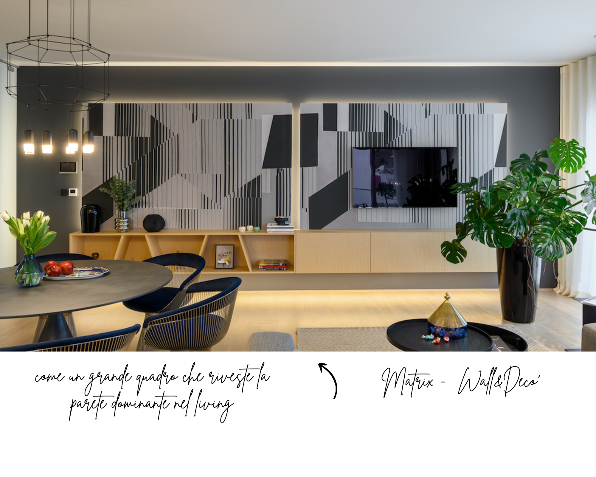 Posata solo su una parete, magari dominante nella zona giorno, proprio come un grande quadro,