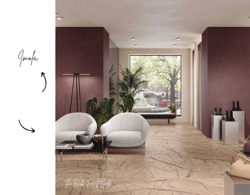 Per quanto riguarda i rivestimenti THE ROCK™ di Imola Ceramica, ha senza dubbio attirato l'attenzione con la variante Forest Gold, una pietra rara, inusuale che si caratterizza per uno sfondo che varia dall’ocra al nocciola con particolari venature che ricordano dei rami fossili.