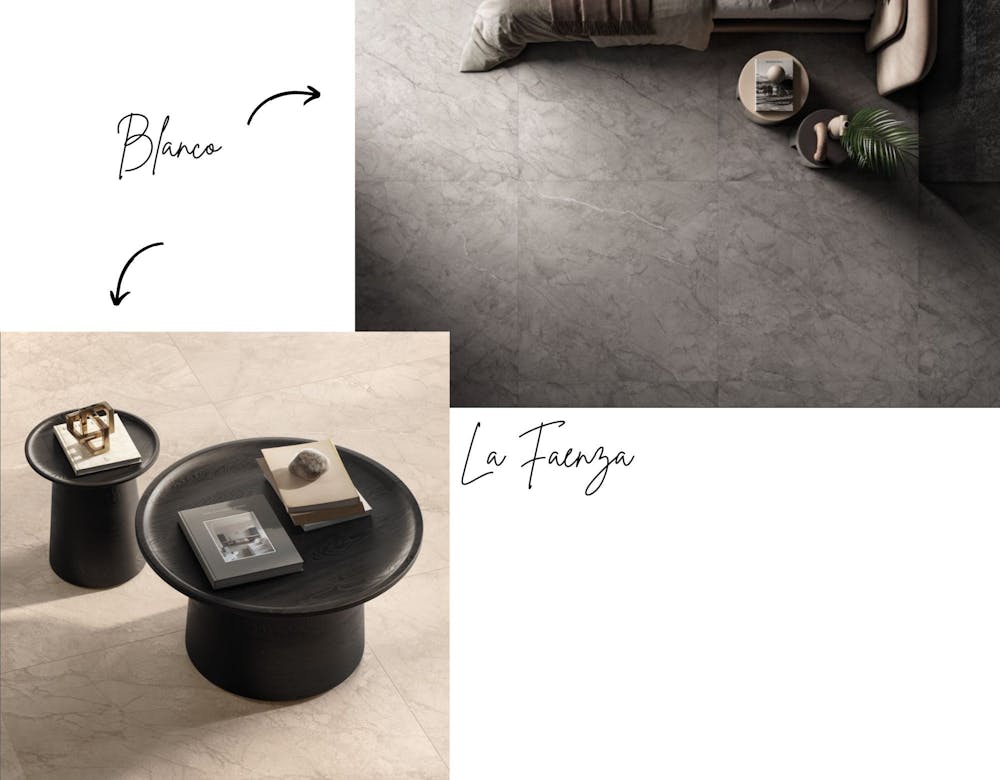Interessanti anche le nuove proposte di Ceramica La Faenza, come Blanco un effetto pietra che si colloca stilisticamente all’interno del look book di Fragranza e Nube. Una grafica leggera, morbide venature che si sovrappongono, per composizioni a tutto campo sia per pavimenti che rivestimenti.