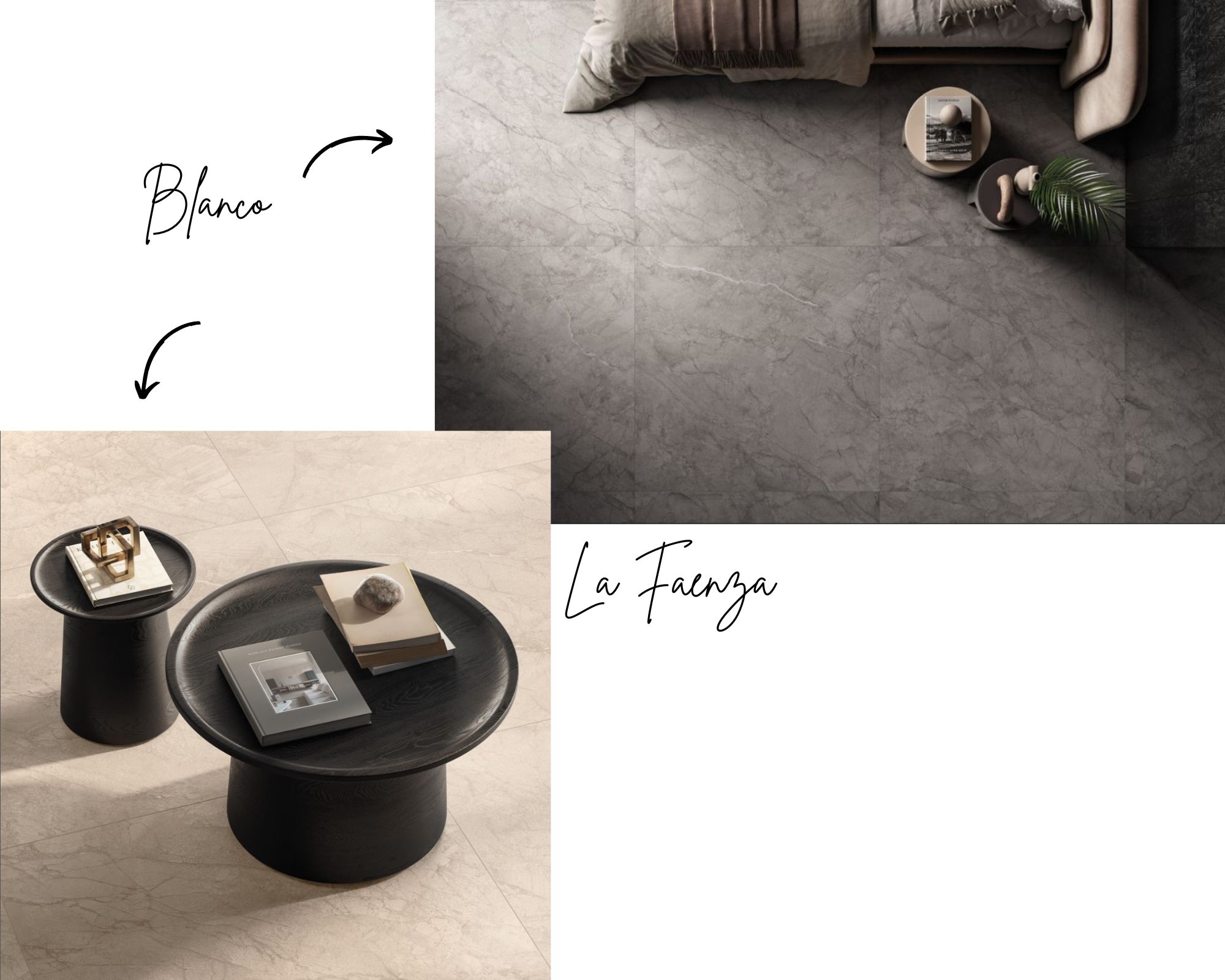 Interessanti anche le nuove proposte di Ceramica La Faenza, come Blanco un effetto pietra che si colloca stilisticamente all’interno del look book di Fragranza e Nube. Una grafica leggera, morbide venature che si sovrappongono, per composizioni a tutto campo sia per pavimenti che rivestimenti.